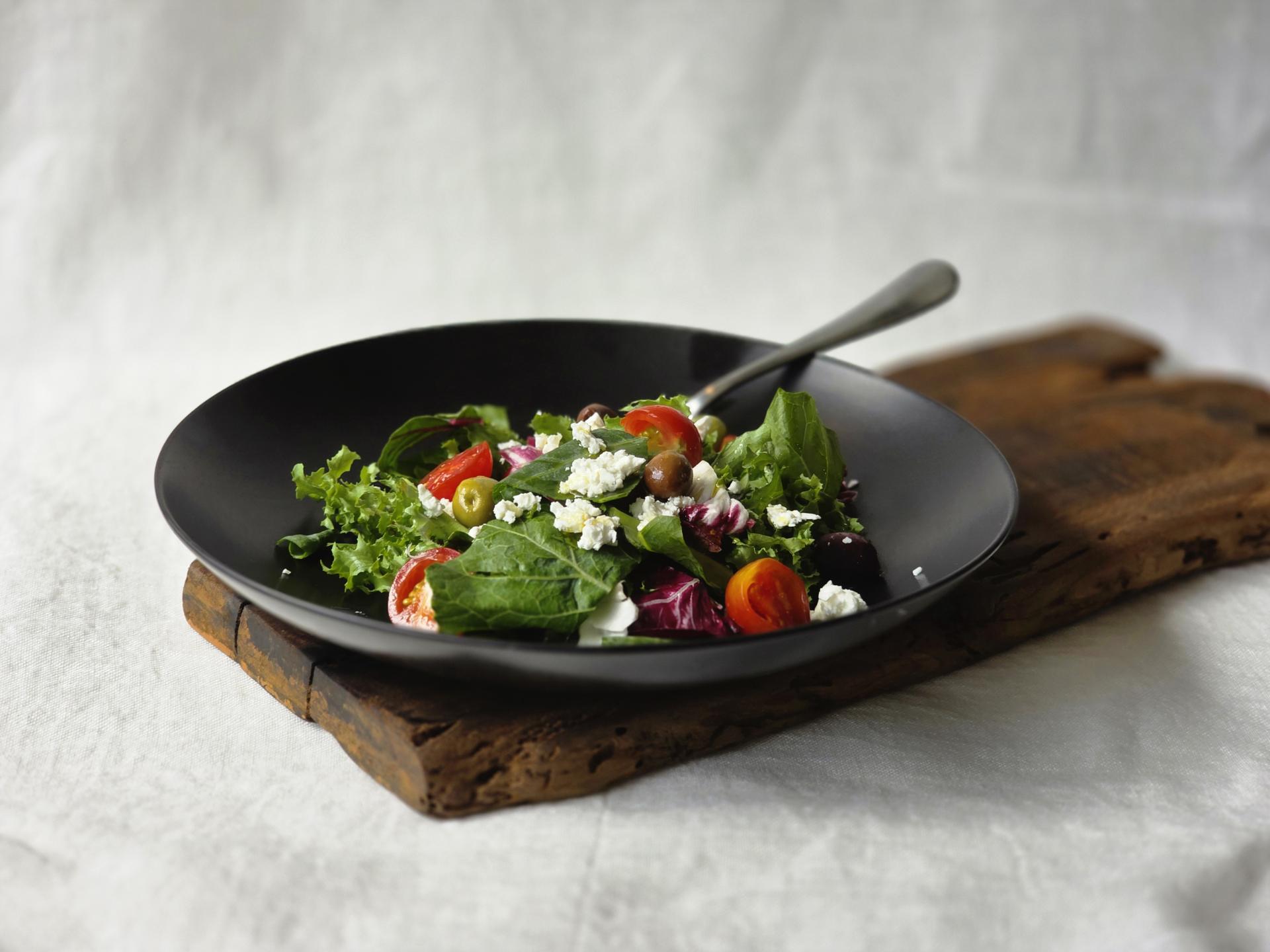적양파, 잘 익은 방울 토마토, 오이 등 다양한 야채와 페타치즈를 넣어서 신선한 올리브 오일과 후추를 뿌리면 그리스 식단에 빠지지 않는 건강한 샐러드가 완성됩니다.